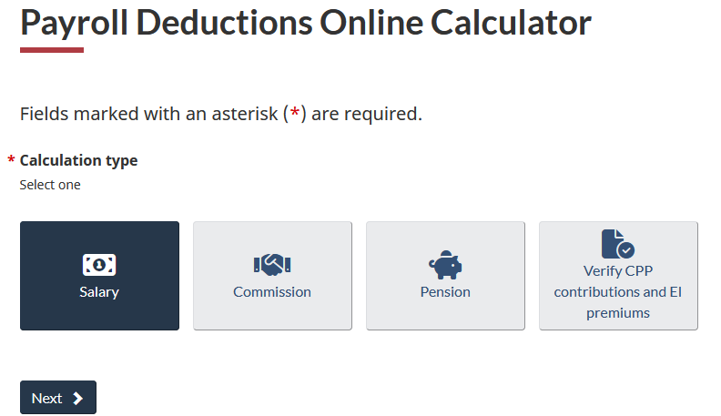 Choose Salary. This treats the input as regular employment income—not a bonus/commission/retroactive payment.Screenshot of the CRA Payroll Deductions Calculator showing the “Salary” calculation type selected.